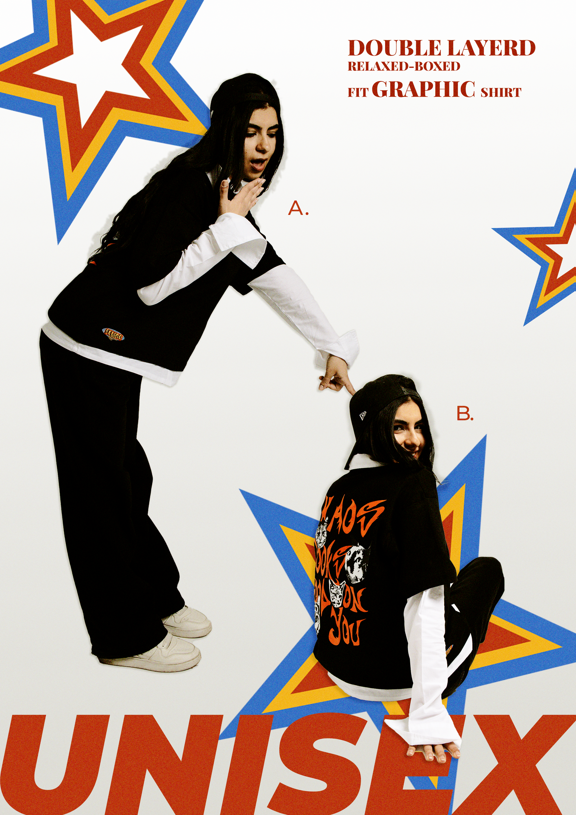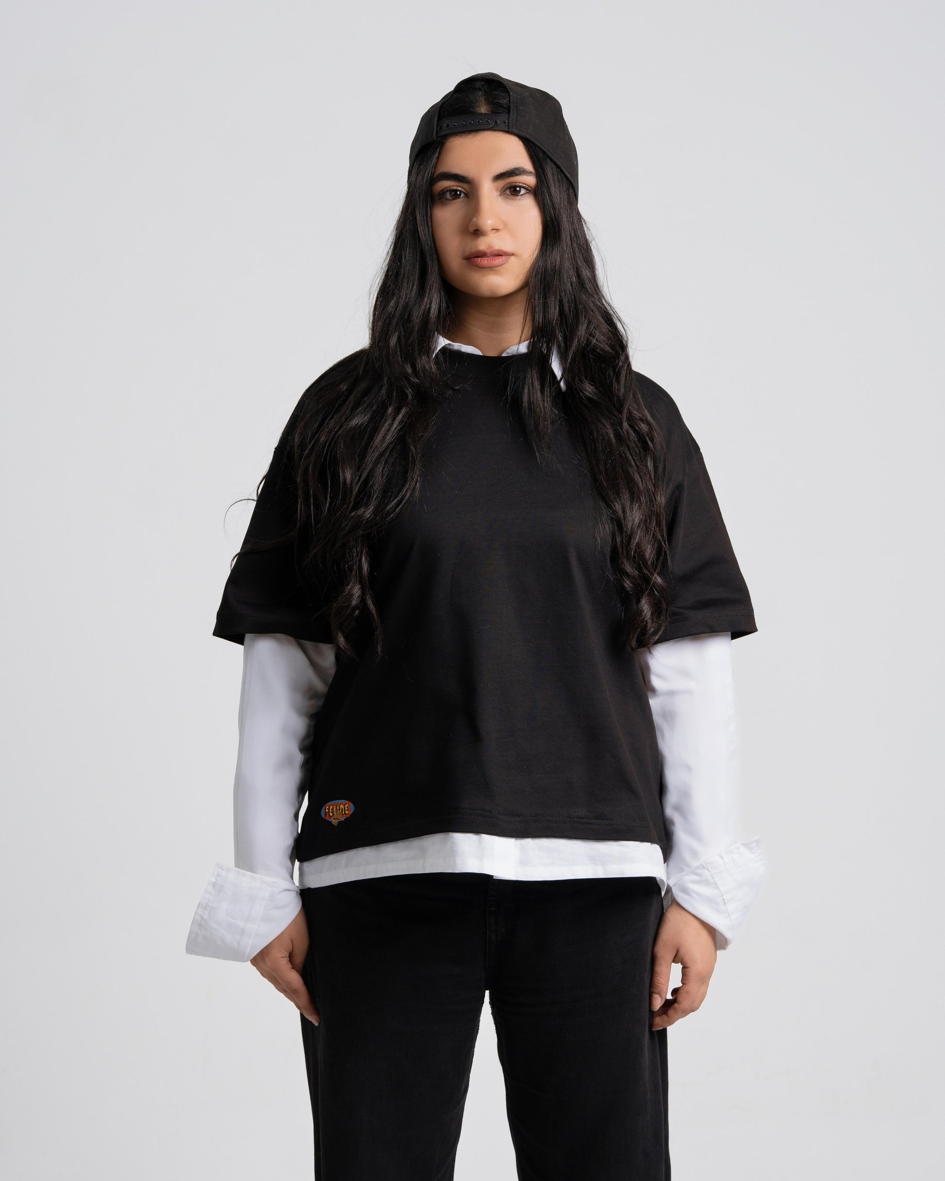 Layered black cotton tee with contrast white collar and sleeves. Features bold cat graphic on the back with edgy typography. Relaxed boxy fit, Heavy Boulevard material and premium poplin shirt .